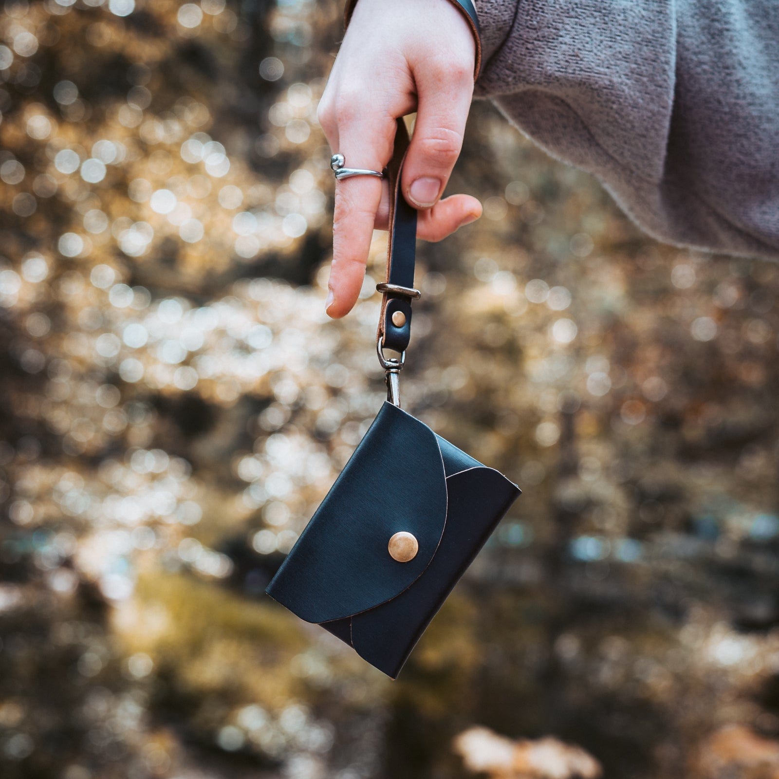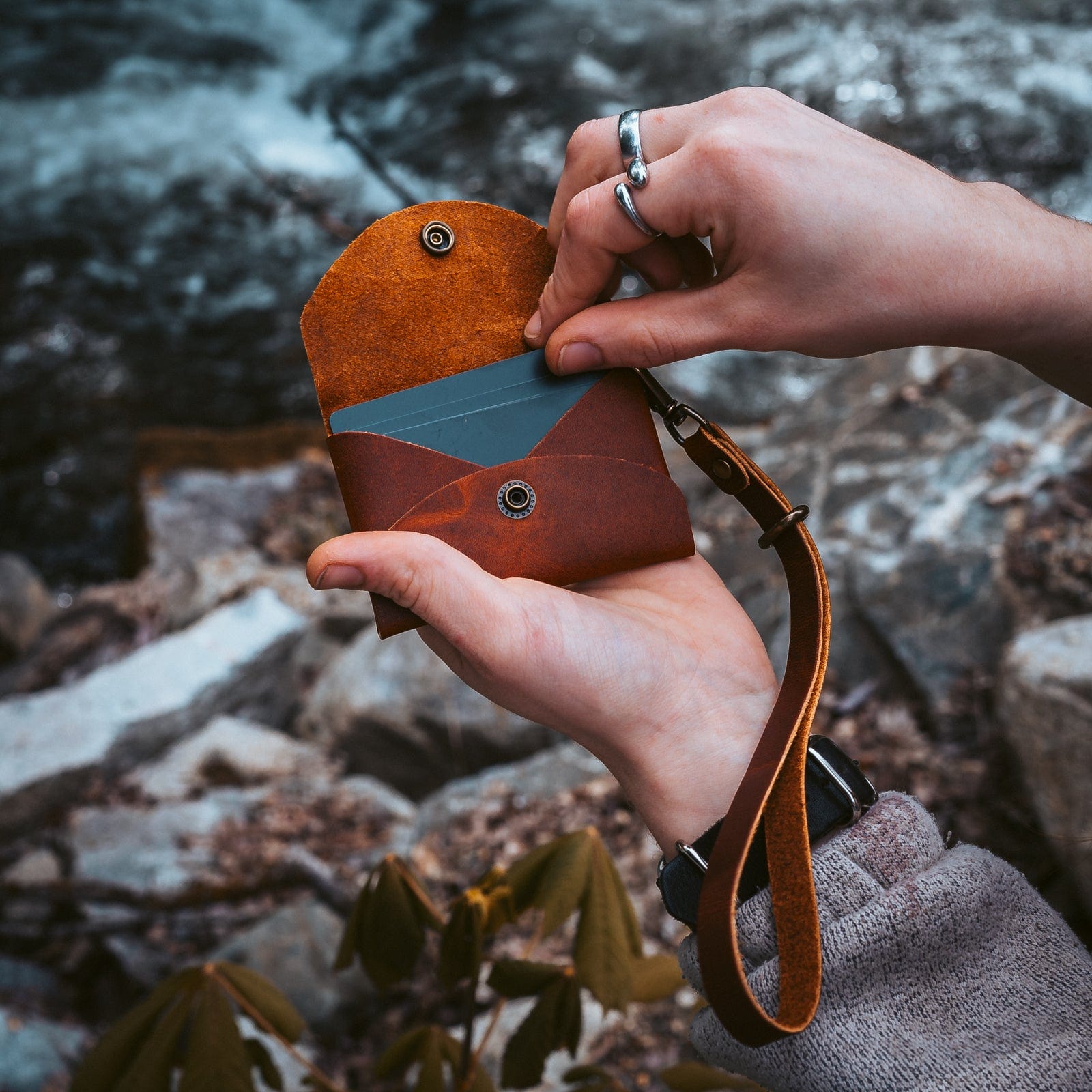 Built from the same full-grain leather we use for everything else, this envelope will age and develop character over time. The detachable wristlet gives you options—clip it to your keys or carry it on its own. A brass snap keeps your cards secure. There are no unnecessary features; just what you need.