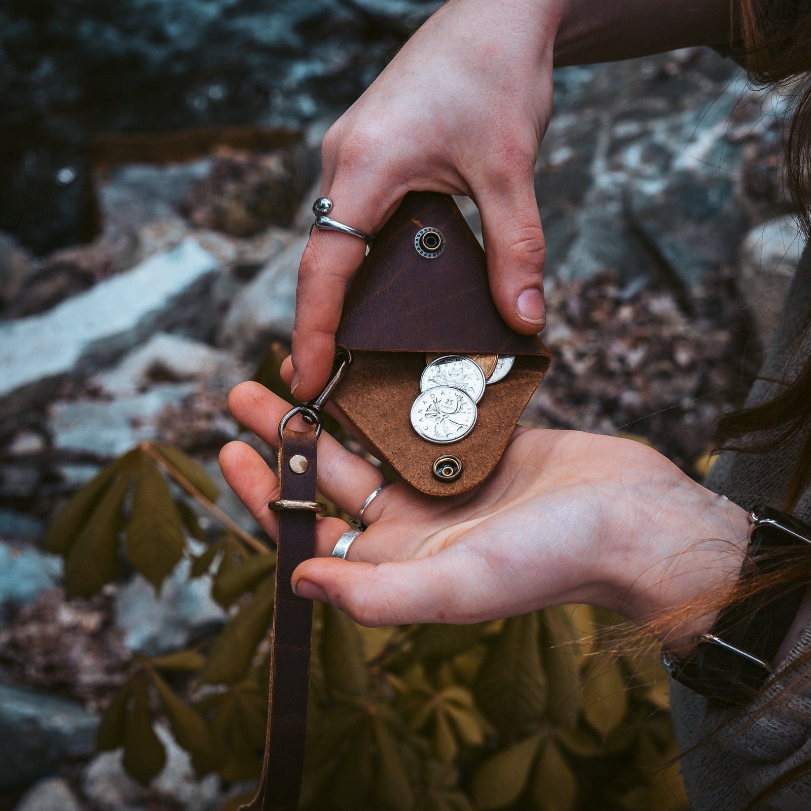 Built from the same full-grain leather we use in all our goods, this pouch develops character with every outing. The triangular design isn't just for looks; it's practical. Toss it in a larger bag or use the detachable wristlet when you want to travel light. Perfect for nights out when a full wallet is overkill, or anytime you need quick access to the small stuff that always seems to disappear.